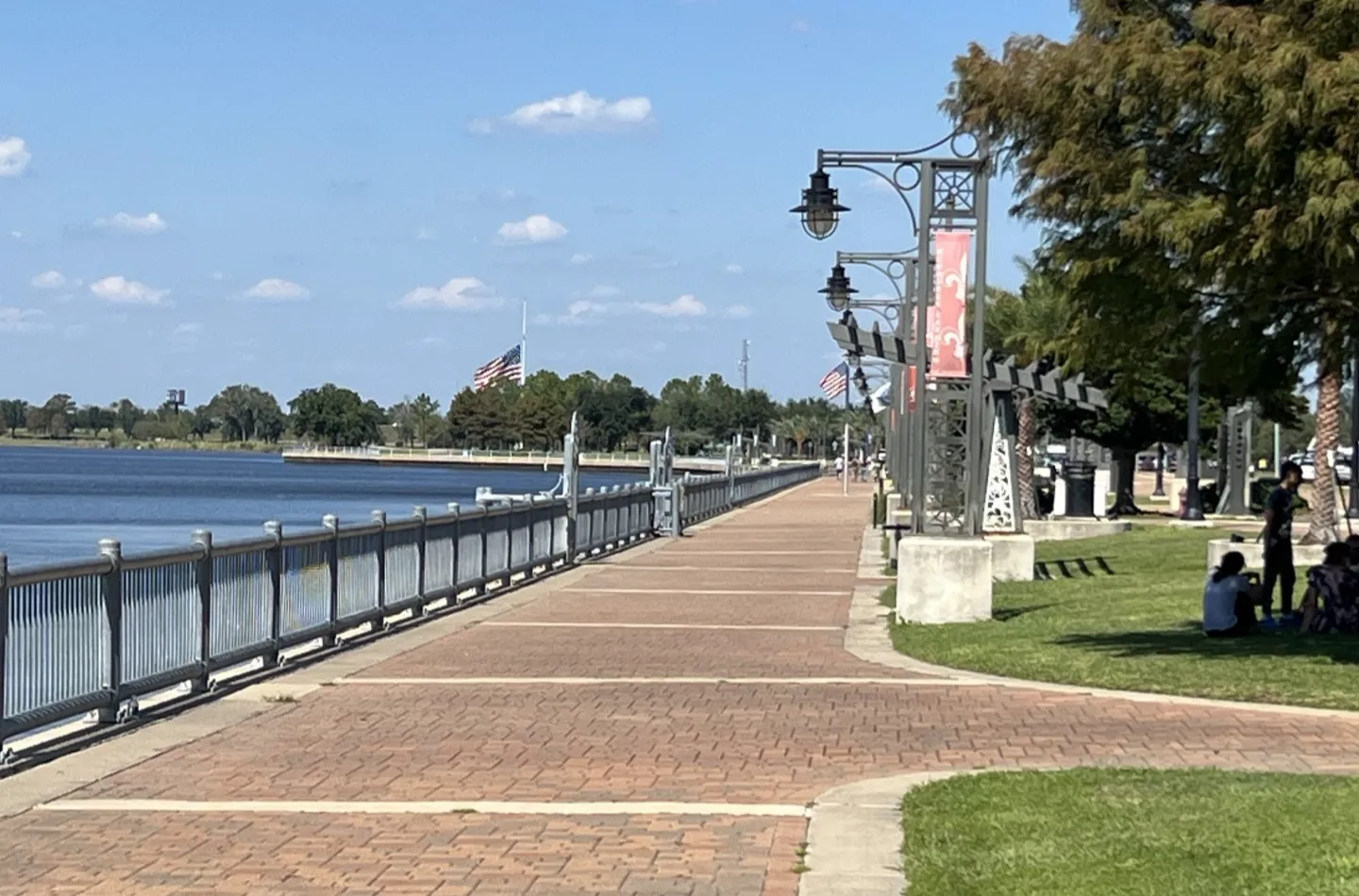 The Lakefront Boardwalk skirts the edges of scenic Lake Charles and features a ___- mile walking and jogging path. Along the Boardwalk, pedestrians can take in the views of the marina, Schooner’s Landing for larger commercial vessels and the Sea Wall. The Boardwalk currently stretches from the Bord du Lac Marina around to Veterans Memorial Park. The scenic path features custom ironwork lampposts with themed banners denoting Landings on the Boardwalk, each of which is home to unique artwork, ranging from a fountain, sculptures and a 9/11 Memorial. Partially covered rest areas are located at various points along the Boardwalk.